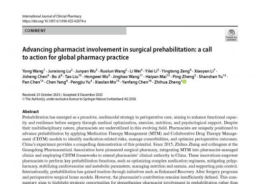 關于藥師利用MTM模式開展外科預康復的呼吁在《國際臨床藥學雜志》(IJCP)發(fā)表