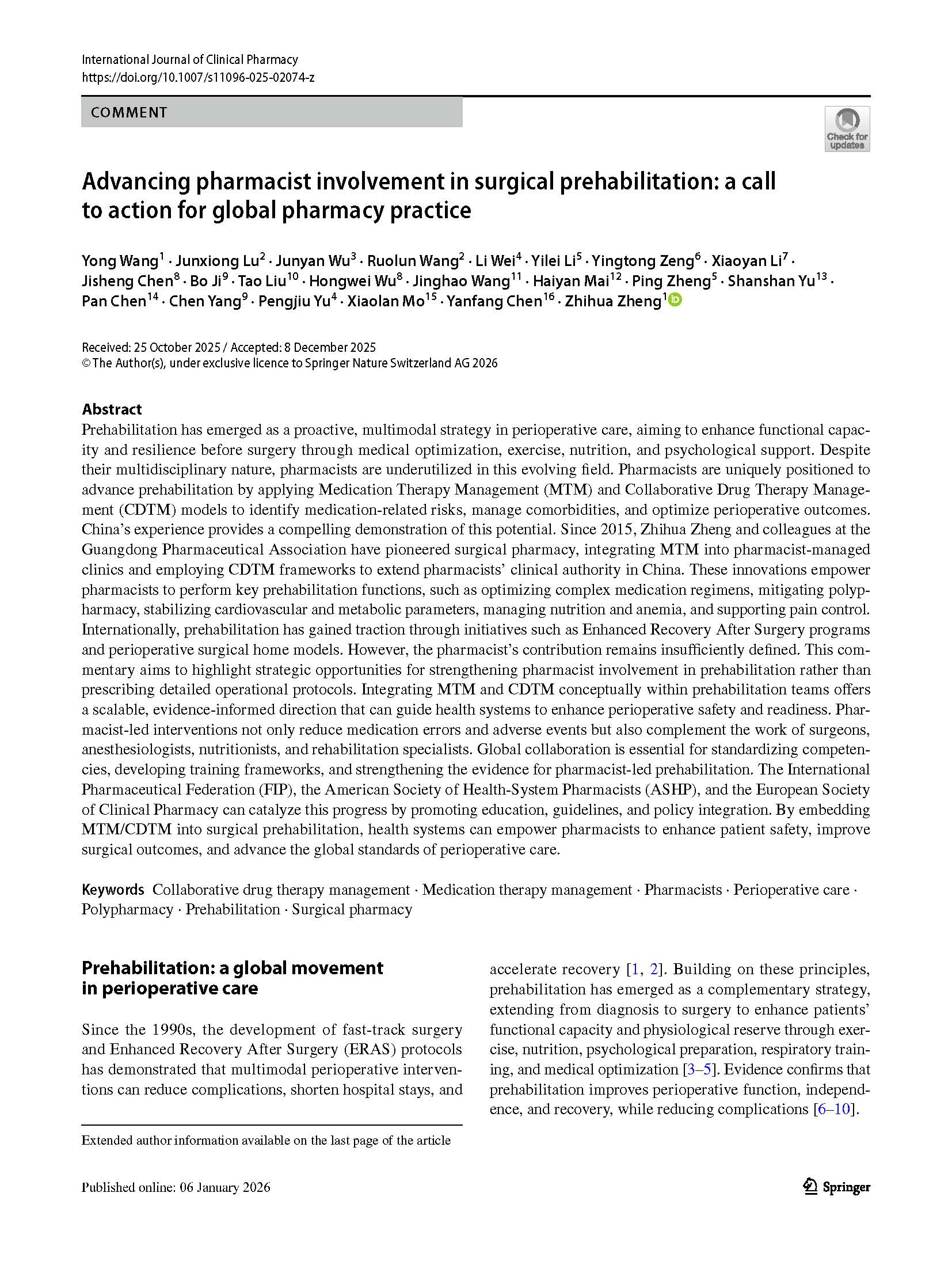 廣東省藥學(xué)會(huì)2025年9月22日呼吁藥師利用藥物治療管理(MTM)模式開展外科預(yù)康復(fù)工作(http://thejerkyshed.com/notification/3416.html),相關(guān)專論在《今日藥學(xué)》雜志發(fā)表(王勇,盧鈞雄,伍俊妍,等.藥師利用藥物治療管理模式開展外科預(yù)康復(fù)[J].今日藥學(xué),2025,35(11):806-812.)。2026年1月6日,相關(guān)呼吁在《國(guó)際臨床藥學(xué)雜志》發(fā)表(Wang, Y., Lu, J., Wu, J. et al. Advancing pharmacist involvement in surgical prehabilitation: a call to action for global pharmacy practice. Int J Clin Pharm (2026). https://doi.org/10.1007/s11096-025-02074-z.),鏈接為:https://link.springer.com/article/10.1007/s11096-025-02074-z,摘要為:
