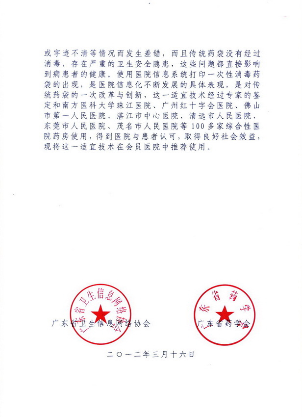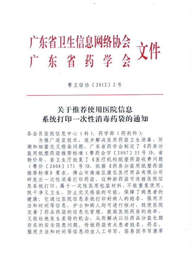 關(guān)于推薦使用醫(yī)院信息系統(tǒng)打印一次性消毒藥袋的通知(粵衛(wèi)信協(xié)〔2012〕2號(hào))