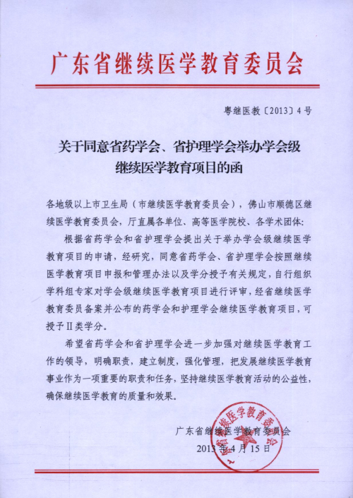根據(jù)廣東省繼續(xù)醫(yī)學(xué)教育委員會《關(guān)于同意省藥學(xué)會、省護理學(xué)會舉辦學(xué)會級繼續(xù)醫(yī)學(xué)教育項目的函》(粵繼醫(yī)教[2013]4號)的批復(fù),本會獲得授予繼續(xù)醫(yī)學(xué)教育項目Ⅱ類學(xué)分資格。