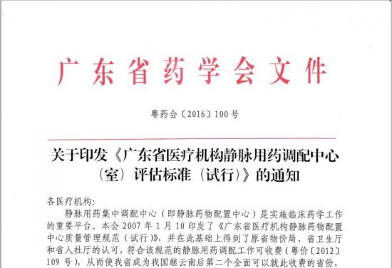 關(guān)于印發(fā)《廣東省醫(yī)療機(jī)構(gòu)靜脈用藥調(diào)配中心(室)評(píng)估標(biāo)準(zhǔn)(試行)》的通知