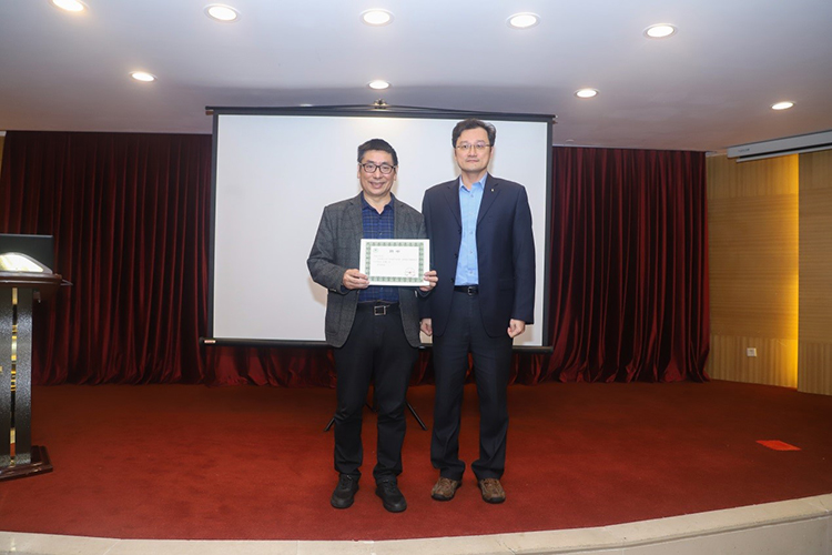 鄭志華秘書長(zhǎng)為張亞歷主任委員頒發(fā)聘書