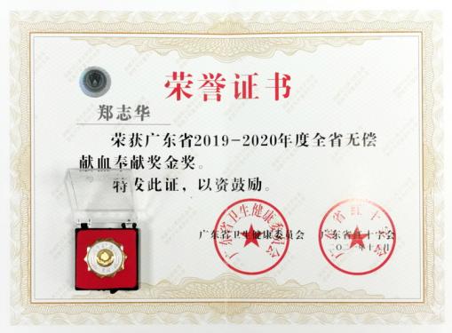 熱血獻(xiàn)他人、廿年不間斷--廣東省藥學(xué)會副理事長兼秘書長鄭志華被授予全省無償獻(xiàn)血奉獻(xiàn)獎(jiǎng)金獎(jiǎng)